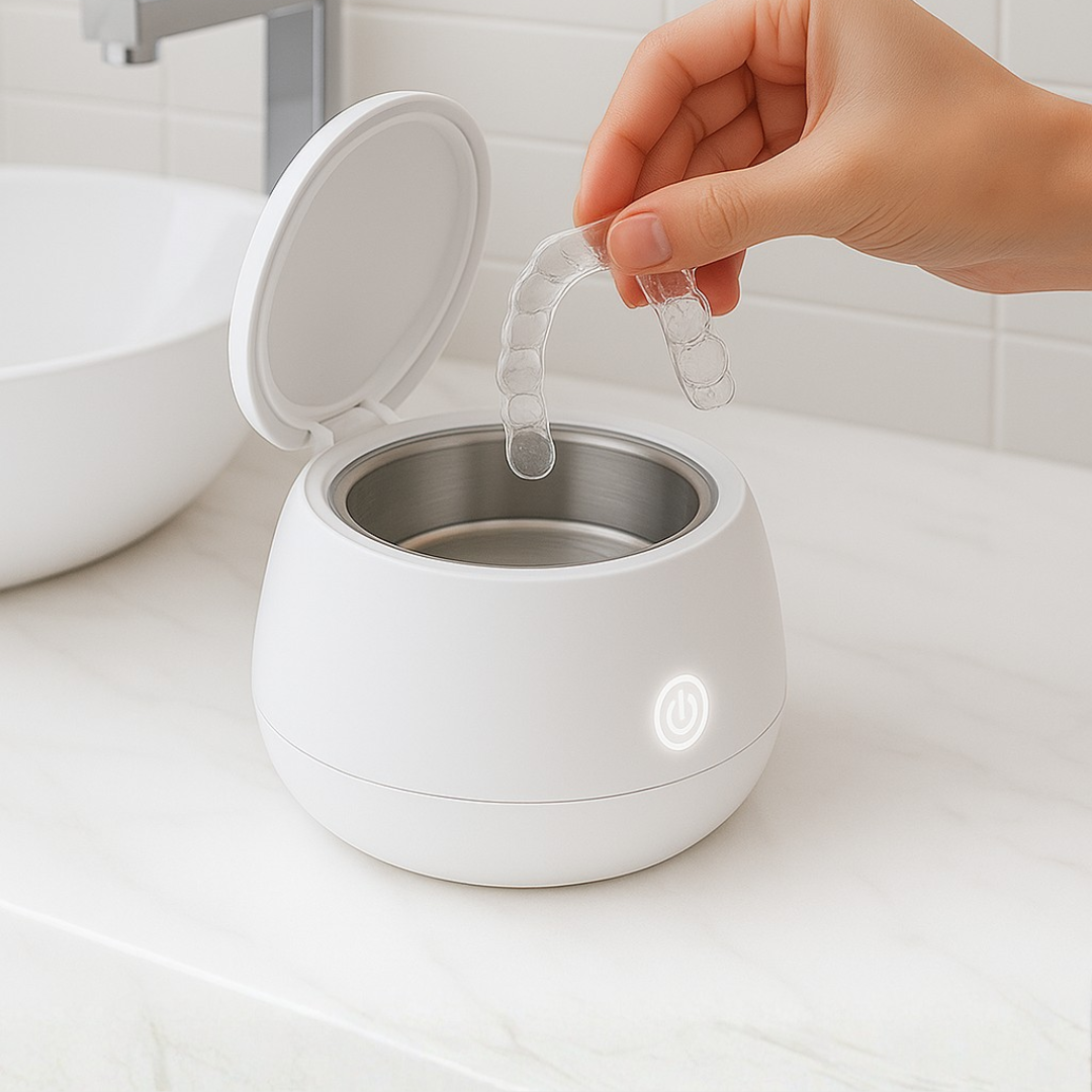 Experience a deep, professional clean from home. Our advanced ultrasonic system removes up to 99% of bacteria, plaque, and buildup from retainers, aligners, and mouth guards, leaving them fresh, clear, and ready to wear in just minutes.